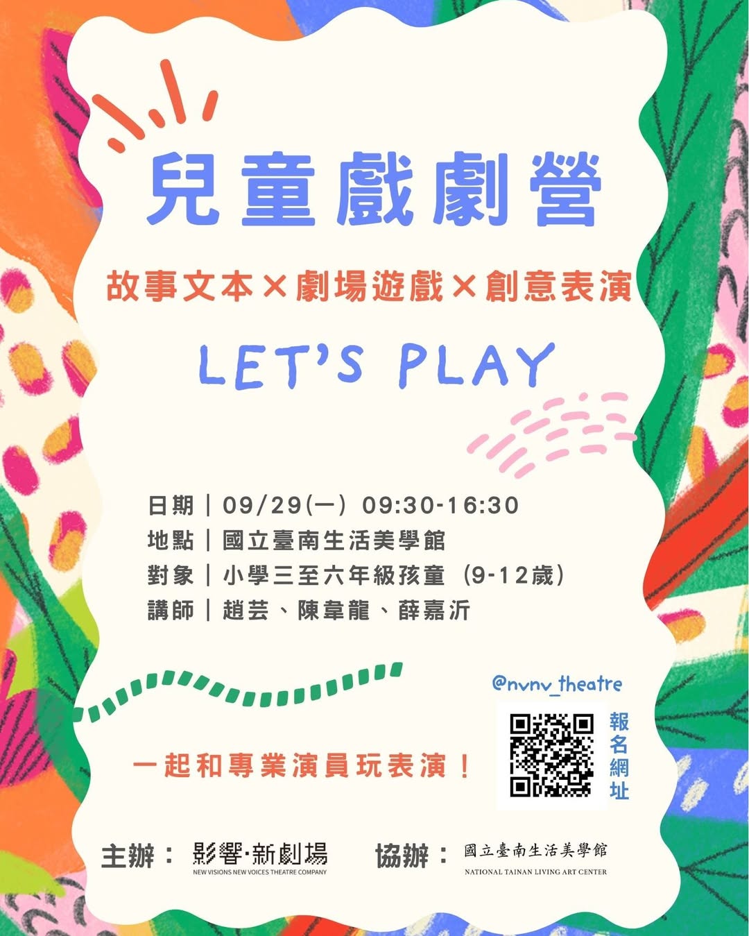 一日兒童戲劇營|讓孩子玩出創意與自信! ✨ 首頁 最新消息 一日兒童戲劇營|讓孩子玩出創意與自信! ✨ 延續上次「臺澳兒童戲劇創作工作坊」的熱烈迴響,影響 ‧ 新劇場將於九月推出 ⊹⊹⊹ 一日兒童戲劇營 ⊹⊹⊹邀請專業講師設計課程,透過戲劇遊戲與想像引導,結合故事文本進行創意表演,讓孩子在劇場中盡情發揮!歡迎愛演戲、想表演、充滿創造力的小朋友,這裡就是屬於你們的舞台! 𝟴 / 𝟯𝟭 前報名可享九折優惠,趕快把握機會! ✦ 活動資訊 ✦ 時間|𝟵 / 𝟮𝟵 ㊀ 𝟵:𝟯𝟬 – 𝟭𝟲:𝟯𝟬 地點|國立臺南生活美學館 對象|國小三至六年級的孩童( 𝟵 – 𝟭𝟮 歲) 報名|https://forms.gle/WkqkFgJ7tUrTQ6Ha8 主辦|影響.新劇場 協辦|國立臺南生活美學館